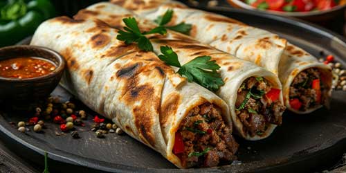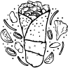Meat shawarma served in Lebanese bread with tahini sauce and vegetables.