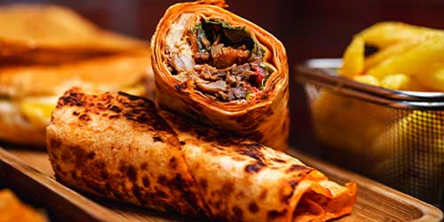Chicken shawarma served in our special bread cut into small 6 pieces with vegetables and our special sauce comes with fries and soft drink.