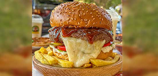 Sandwich of minced beef burger marinated in Turkish way with cheddar cheese and vegetables comes with fries and soft drink.